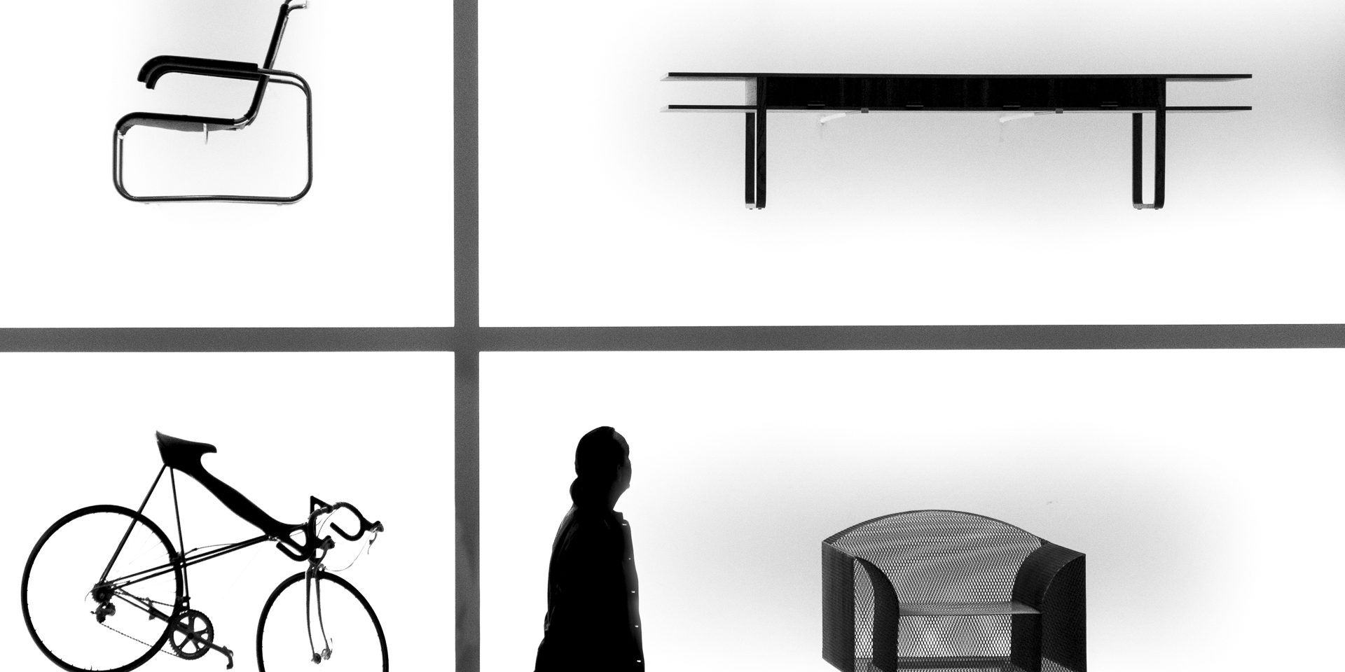 This image is called”Modern Things”. It was taken at the Pinakothek der Moderne in Munich. A lovely museum well worth a visit if you are in town. Next to fine art it shows design objects, architecture, graphics and photography. I was looking at the industrial design wall, showing all kinds of different ´objects from furniture to bicycles when a casual visitor stepped in front of my lens and seemed to blend in as a exhibit part himself. The backlight wall called for a strong silhouette which I achieved through black and white conversion in Google’s Silver Efx. Hope you like the result, and best of all, come and see the print at my exhibition